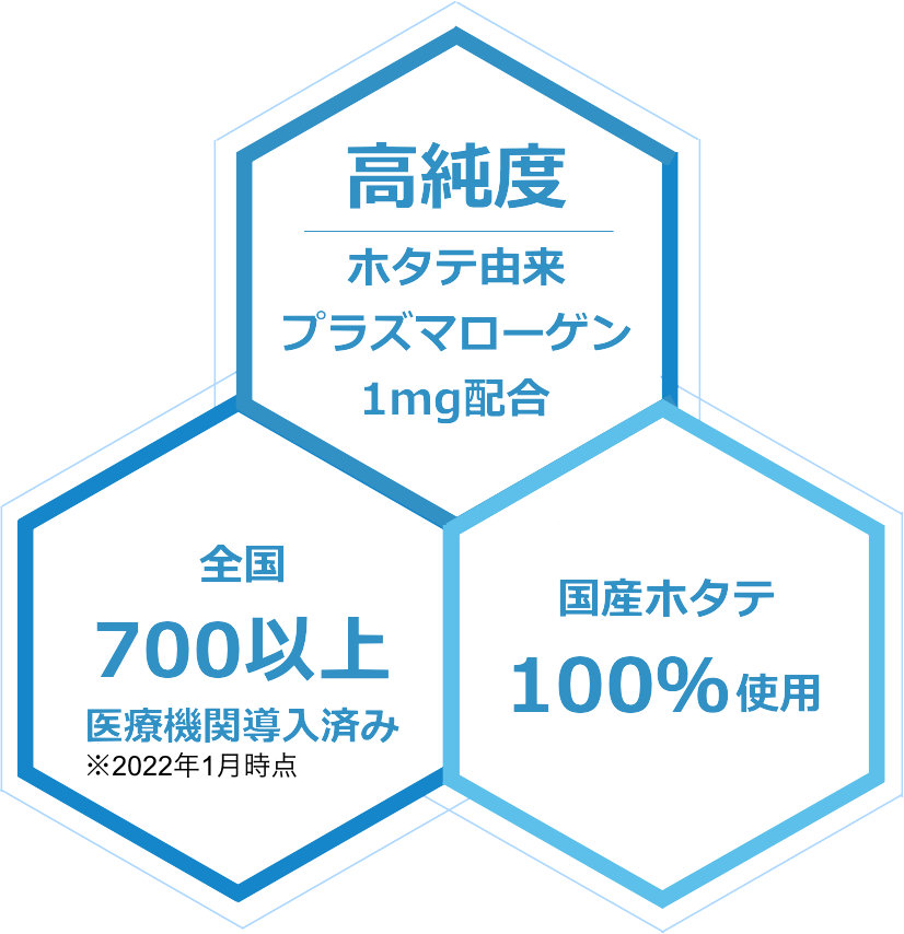 特殊技術で抽出・精製したホタテ由来プラズマローゲンで世界的医学誌にも認められる結果がでていることからもわかるとおり、高い精製度こそがポイントです。